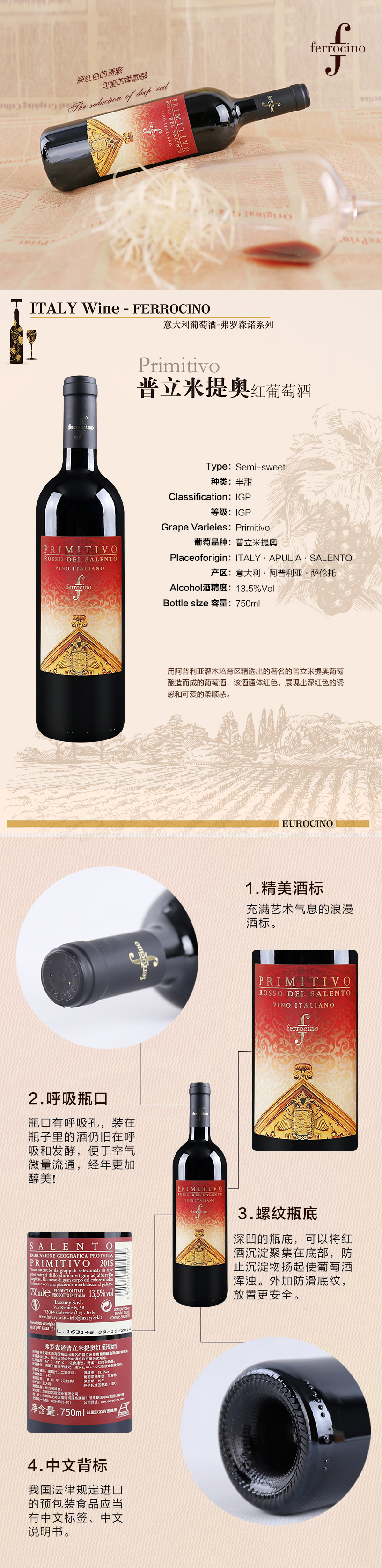 類型:半甜demi-sweet 產區(qū):薩倫托 SALENTO 等級:IGP 酒莊:弗羅森諾 年份:2013/2014 酒精度:13.5%vol 容量:750ml 葡萄品種:普立米提奧Primitivo 品酒師品鑒:用阿普利亞灌木培育區(qū)精選出的著名的普立米提奧葡萄釀造而成的葡萄酒,該酒通體紅色,展現(xiàn)出深紅色的誘惑和可愛的柔順感。