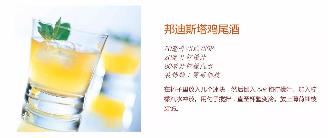 除了凈飲,還可以隨個(gè)人的習(xí)慣和愛好進(jìn)行花樣混搭飲用,通過創(chuàng)意無限的時(shí)尚飲法將白蘭地的絕妙香氣發(fā)揮出來,調(diào)配成雞尾酒是常見的方式,也開發(fā)出了很多世界上著名的白蘭地雞尾酒飲法。